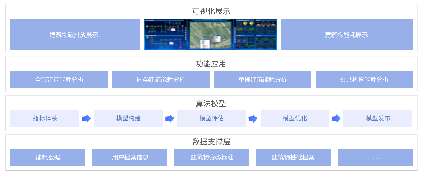 基于大數(shù)據(jù)分析與可視化技術(shù)的應(yīng)用,實(shí)現(xiàn)對城市能耗情況進(jìn)行分析與可視化監(jiān)控,幫助各級管理單位從建筑物的視角,掌握城市整體的能耗水平與不同維度的能耗結(jié)構(gòu)。