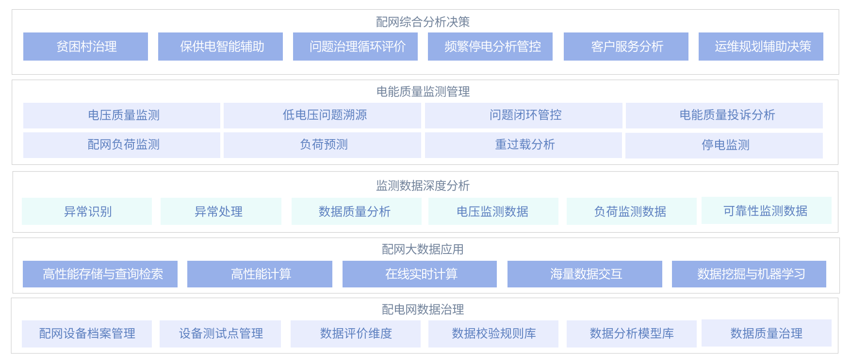系統(tǒng)主要聚焦于配電網(wǎng)電能質(zhì)量管理,以大數(shù)據(jù)、人工智能、物聯(lián)網(wǎng)、云等技術(shù)為驅(qū)動(dòng),充分利用配電網(wǎng)數(shù)據(jù)信息,基于智能電網(wǎng)和物聯(lián)網(wǎng)建設(shè)成果,通過(guò)電網(wǎng)信息融合、大數(shù)據(jù)挖掘分析、人工智能及交互 式可視化技術(shù),實(shí)現(xiàn)在線開(kāi)展配網(wǎng)電能質(zhì)量監(jiān)測(cè)和治理,對(duì)電能質(zhì)量問(wèn)題進(jìn)行監(jiān)控、分析、溯源、治理、 評(píng)價(jià)和決策應(yīng)用,同時(shí)結(jié)合網(wǎng)架可靠性評(píng)價(jià)體系,為配電網(wǎng)規(guī)劃改造、運(yùn)維及應(yīng)急保供電提供輔助決策 支撐,從而提升供電可靠性和客戶滿意度。