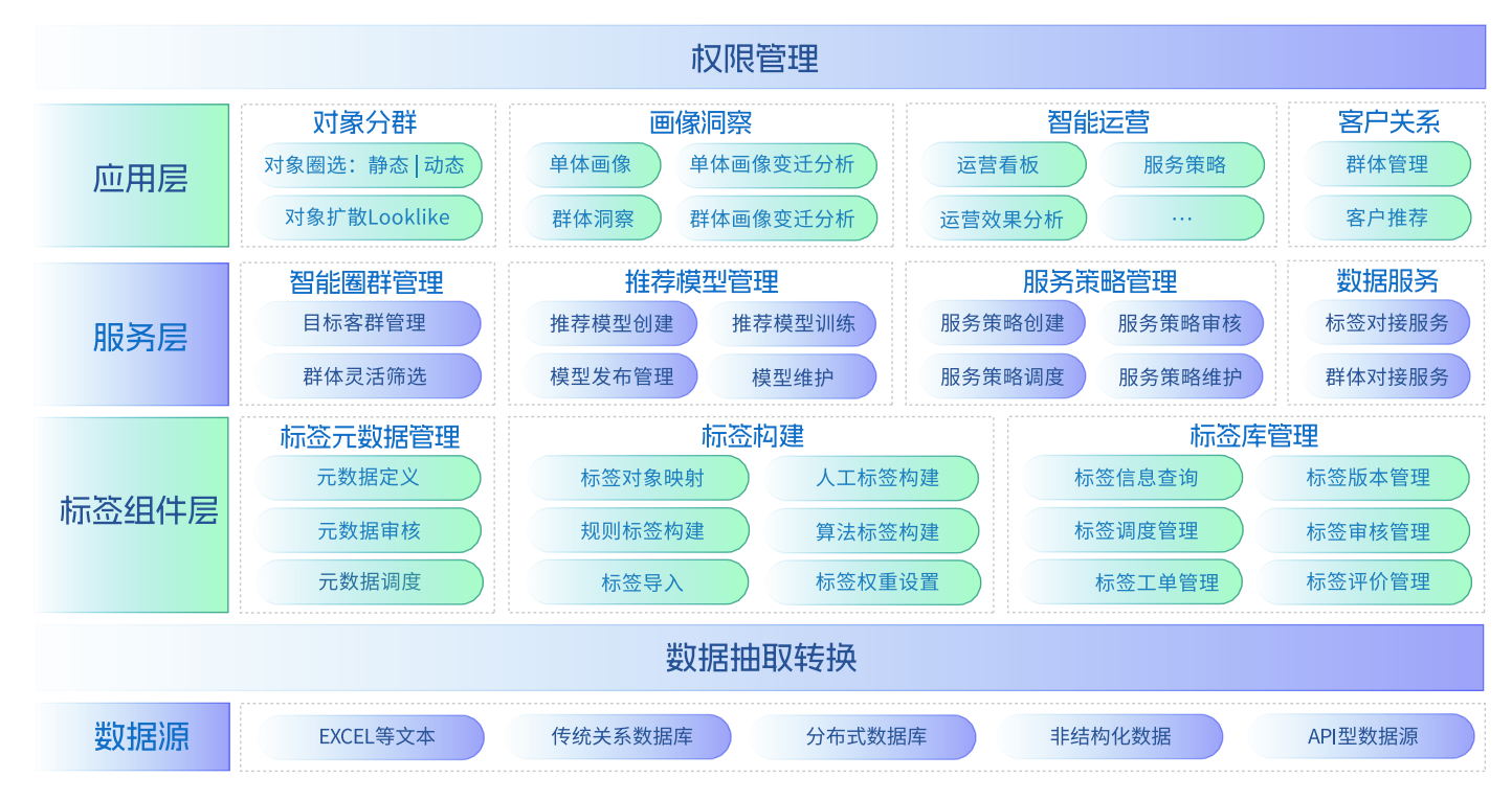 一款面向業(yè)務(wù)增長的全域數(shù)據(jù)賦能中臺(tái),幫助企業(yè)打破數(shù)據(jù)孤島,建立統(tǒng)一的人、物、關(guān)系標(biāo)簽體系 和畫像視圖。平臺(tái)以現(xiàn)代企業(yè)數(shù)字化轉(zhuǎn)型過程中各類業(yè)務(wù)場景為驅(qū)動(dòng),以標(biāo)簽為手段幫助企業(yè)從海量數(shù)據(jù)中提煉業(yè)務(wù)對(duì)象深層次的特征與需求,促進(jìn)業(yè)務(wù)精準(zhǔn)化、個(gè)性化,實(shí)現(xiàn)業(yè)務(wù)的“千人千面,一人一策”, 支撐企業(yè)充分發(fā)揮數(shù)據(jù)價(jià)值,全面認(rèn)知客戶和企業(yè)資源。通過群體圈選、群體洞察、數(shù)據(jù)服務(wù)、智能運(yùn) 營,賦能企業(yè)數(shù)字化轉(zhuǎn)型、精細(xì)化運(yùn)營,實(shí)現(xiàn)數(shù)據(jù)驅(qū)動(dòng)增長,推動(dòng)企業(yè)數(shù)字化轉(zhuǎn)型的有力工具。