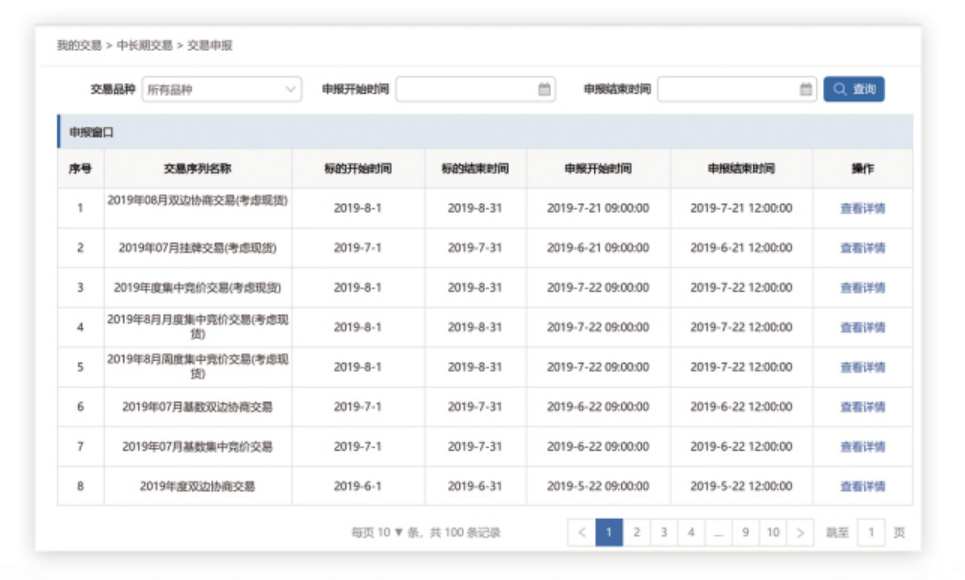 按照年度/月度開(kāi)展市場(chǎng)雙邊協(xié)商、市場(chǎng)掛牌交易、年度集中交易、月度集中交易等交易品種的交易申報(bào)操作,支持跨省區(qū)和省內(nèi)的交易開(kāi)展。