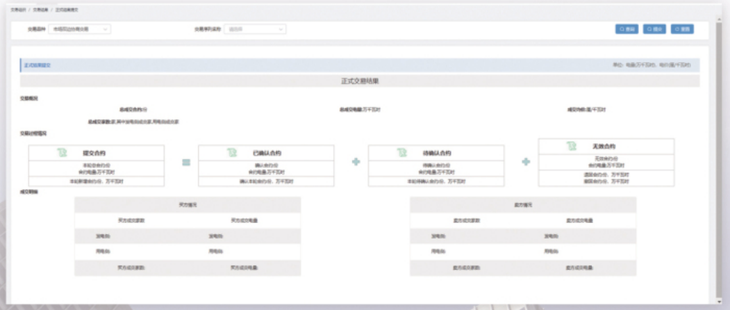 是指交易閉市后,電力交易機(jī)構(gòu)對(duì)各市場(chǎng)主體提交的申報(bào)結(jié)果進(jìn)行統(tǒng)計(jì)并校核的過(guò)程,包括對(duì)交易結(jié)果概況、交易申報(bào)數(shù)據(jù)等進(jìn)行校驗(yàn)等操作。