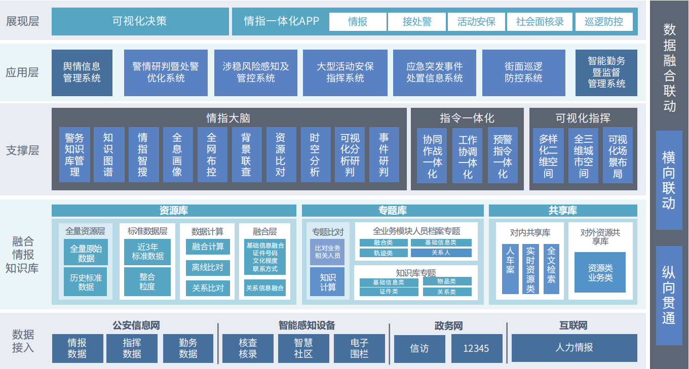 情指一體化綜合實(shí)戰(zhàn)平臺按照“情指一 體化1+1>2”的總體思路,依托警務(wù)云的各類數(shù)據(jù)資源,將情報(bào)、指揮、勤務(wù)、行動(dòng) 等業(yè)務(wù)應(yīng)用進(jìn)行高度融合,以“ 情 指 大 腦”、“指令一體化”、“警務(wù)要素可視化”為核心,支撐處警優(yōu)化 、社會維穩(wěn) 、巡邏防控、活動(dòng)安保、應(yīng)急處置等業(yè)務(wù)應(yīng)用場景。 最終實(shí)現(xiàn)公安 “看得見、呼得通、調(diào)得動(dòng)、 能研判、防得住”的警務(wù)實(shí)戰(zhàn)新需求。